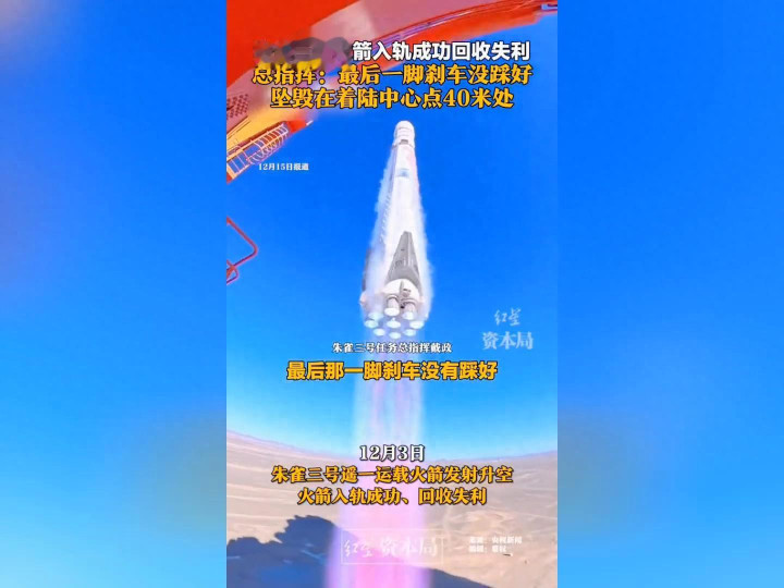 12月3日,朱雀三号遥一运载火箭发射升空,火箭入轨成功,回收失利。朱雀三号任务总指挥戴政复盘时表示:"从距离地面40公里一直到最后3公里,表现非常完美。在3公里的时候,要做一次着陆点火,类似于急刹车,让高度为0的时候速度也降为0"。