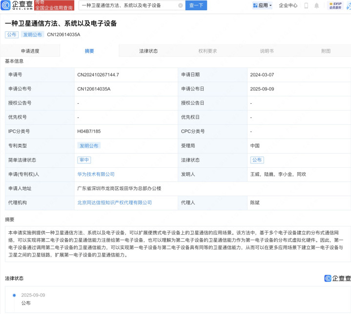 企查查APP显示,近日,华为技术有限公司申请的“一种卫星通信方法、系统以及电子设备”专利公布。企查查专利摘要显示工程配资,本申请实施例提供一种卫星通信方法、系统以及电子设备,可以扩展便携式电子设备上的卫星通信的应用场景。该方法中,基于多个电子设备建立的分布式通信网络,可以实现将第二电子设备的卫星通信能力注册给第一电子设备,也可以理解为第二电子设备的卫星通信能力作为第一电子设备的分布式虚拟化硬件。因此,第一电子设备通过调用第二电子设备的卫星通信能力,可以实现第一电子设备与第二电子设备具有同等的卫星通信能力,从而可以在更多应用场景下建立第一电子设备与卫星之间的卫星链路,扩展第一电子设备的卫星通信能力。