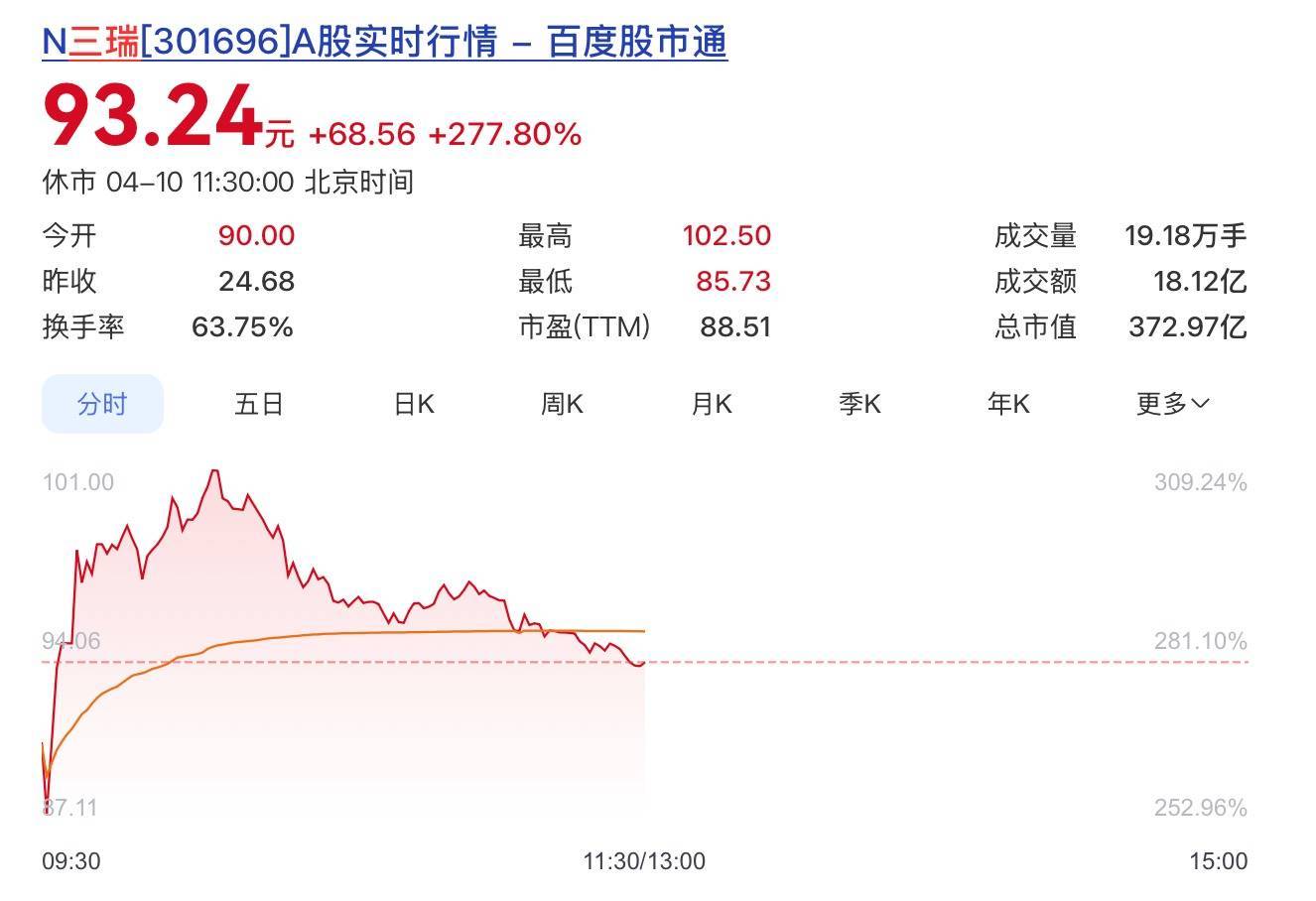 今日开盘,三瑞智能报90元较发行价24.68元大涨264.67%,对应市值约360.01亿元,盘中最高触及102.5元。截至午间休市,其股价涨277.8%报93.24元,总市值372.97亿元。