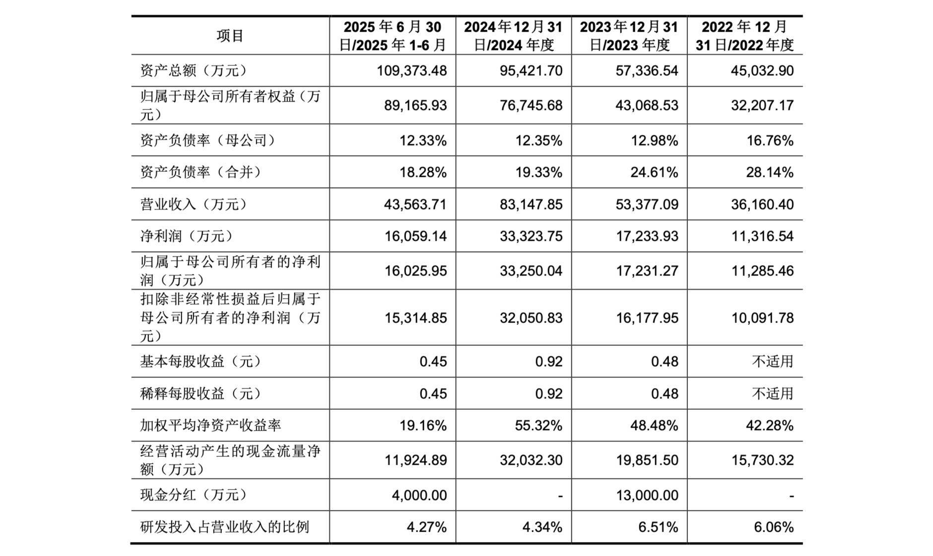 报告期内,三瑞智能的营业收入分别约3.62亿、5.34亿、8.31亿、4.36亿元,最近三年营业收入复合增长率为51.64%;主营业务毛利率分别为 52.54%、55.95%、59.76%、59.35%;净利润分别约1.13亿、1.72亿、3.33亿、1.61亿元;扣非归母净利润分别约1.01亿、1.62亿、3.21亿、1.53亿元。